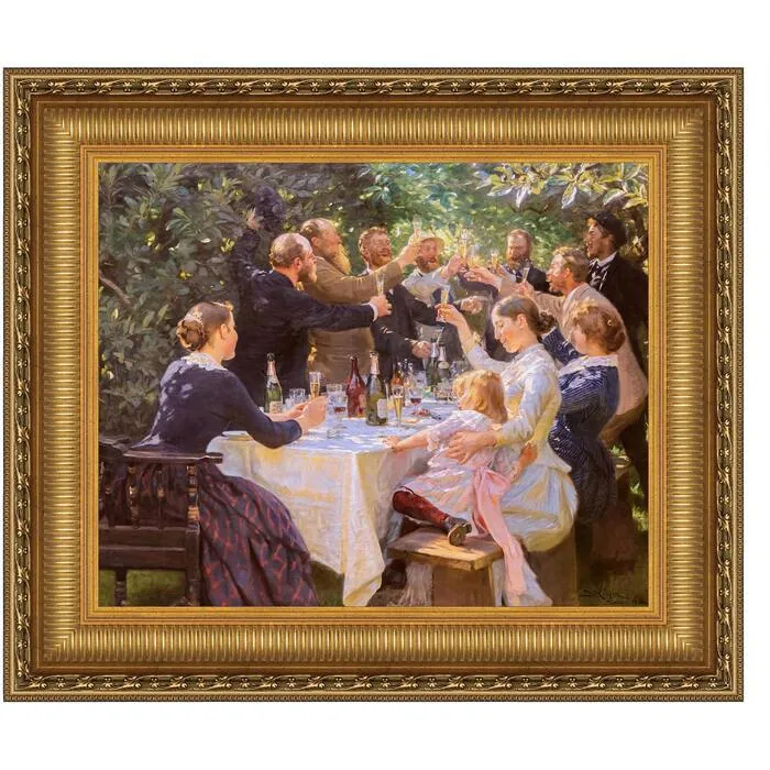 A remote fishing village in Denmark, Skagen was a gathering place for many Danish, Norwegian and Swedish artists. This celebratory party was a gathering of many artists, and friends and an important woman painter, Anna Archer with her daughter along with Kroyer himself painted in the white suit. The guests raise their glasses in a champagne toast as the sunlight sparkles off the glasses and the light glints, reflecting off the surrounding leaves. Norwegian-Danish painter Kroyer painted in the naturalist style but was influenced by contemporary Impressionists as he studied in Copenhagen, Paris and Leon and traveled extensively throughout his life. The authentic stretched canvas replica painting captures the original work's texture, depth of color, and even its subtle brushstrokes, which are applied by hand exclusively for Design Toscano. Our replica 4.375" wide, European style, bright gold-toned, ribbed frame is cast in quality designer resin with an acanthus leaf and floret border that draws the eye toward the beautiful image. Proudly printed and framed in the USA using imported molding. Grande: 45.25"Wx38.25"H framed (37"Wx30"H image size, 4.375"W frame)