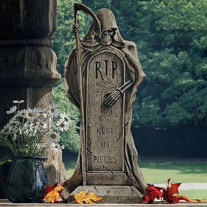 What's Halloween without a cemetery tombstone? This quality designer resin, skeleton-faced Grim Reaper hovers over the grave with a scythe in his bony hands, a ghoulish reminder that's eerily more trick than treat! 12"Wx7½"Dx25"H. 5 lbs.