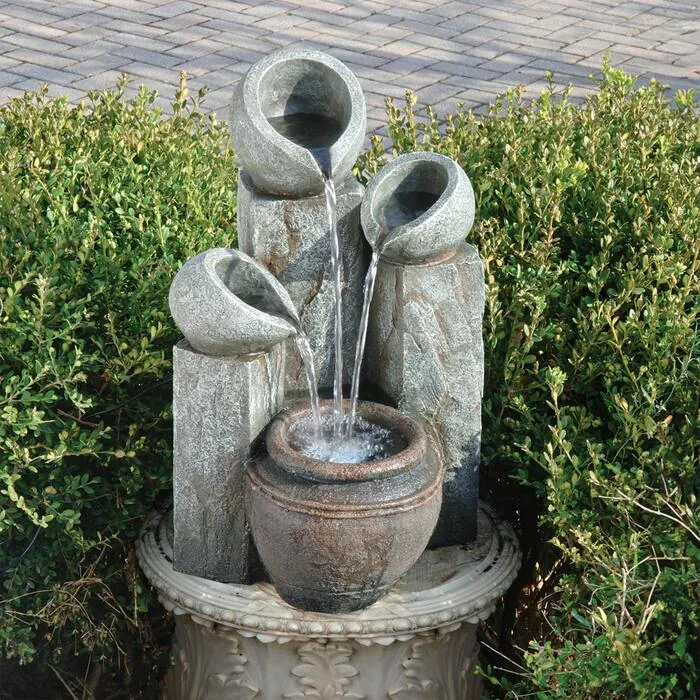 The impressive Hadrian's Villa Four Urn Garden Fountain is sure to be the crowning statement in your garden or on your patio. Multiple cascading streams of water flow to create an in-home oasis and peaceful, meditative atmosphere. With the bottom urn pool highlighted by an included light kit, you can even enjoy this garden fountain in the evening. It can be placed indoors or out and constantly recycles water from a hidden reservoir. Cast in quality designer resin and hand-finished to replicate fine natural stone, our garden fountain also features a UL-listed indoor/outdoor pump. Another quality garden fountain from Toscano! 13½"Wx12"Dx21½"H. 13 lbs.