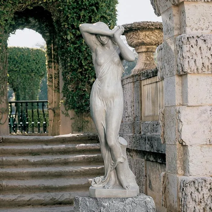 Phryne, a 4th century Green courtesan, was aquitted at her capital offense trial after her lawyer partially opened her robe to reveal her body's stunning beauty. This exquisitely balanced sculpture depicts the exquisite maiden shielding her eyes from the judges. Cast in quality designer resin with a faux stone finish to capture each detail, this grand-scale Design Toscano exclusive lends grace and history to home or garden. 12"Wx11"Dx43½"H. 21 lbs.