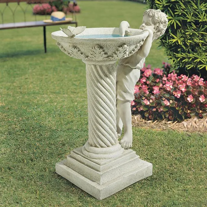 We've never seen a boy who could pass a puddle by! Our young lad climbs barefoot to peek over the wide rim of our pedestal birdbath and mischievously splash a graceful butterfly in this perfect sculptural celebration of childhood summers. Cast in quality designer resin and hand-finished to replicate fine stonework, our artistically rendered Toscano exclusive is a true heirloom investment. 23½"Wx16½"Dx31"H. 28 lbs.