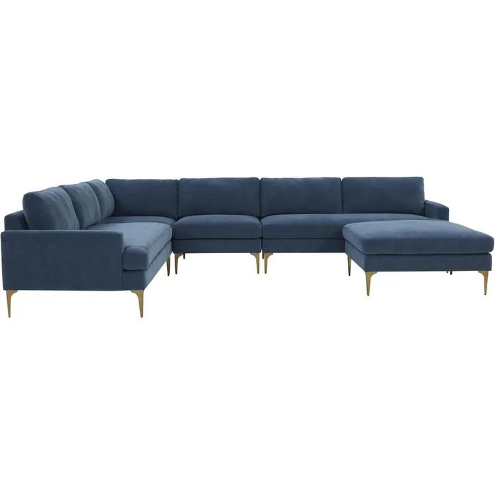 The Serena Collection makes modern design soft and cozy and is sure to become your favorite spot. This 5-piece sectionalâ€â€Âleft-arm loveseat, right-arm loveseat, armless chair, corner chair, and ottomanâ€â€Âis upholstered in a luxurious blue distressed velvet for lots of texture, and is available in three colors. The clean lines are complemented by tall metal legs finished in brass. Enjoy our preset configurations or customize your own design - the Serena is the sectional you have been looking for.