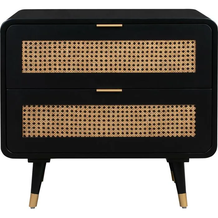 Drawing inspiration from the ever classic mid-century style, the Christine nightstand adds a retro look to any space its placed. This nightstand features spacious drawers, a black Acacia finish embellished with cane webbing and conical legs to complete the look.