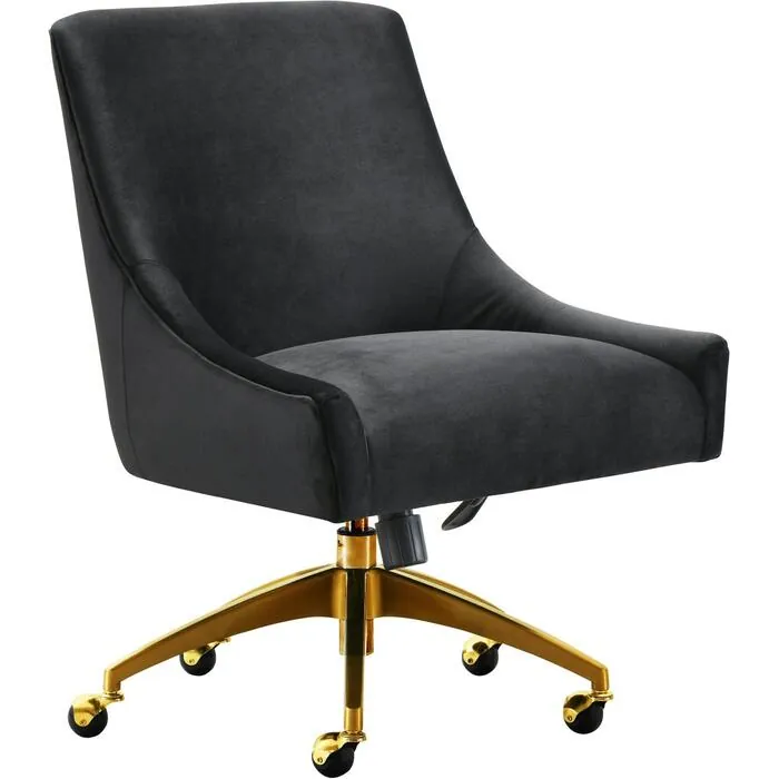 Sit pretty in this sumptuous yet durable velvet chair. The Beatrix swivel chair dazzles as a desk chair or as an accent piece. Available in multiple velvet color options with a fab gold swivel steel base. Prop it into any room for a luxe, glamour effect.