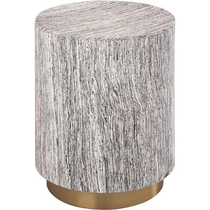 Inspired by petrified logs and singular designs, the Dahlia table is a warm and homey accent piece. This table features a cylindrical body supported by a gold base, and neutral tones perfect for any setting.
