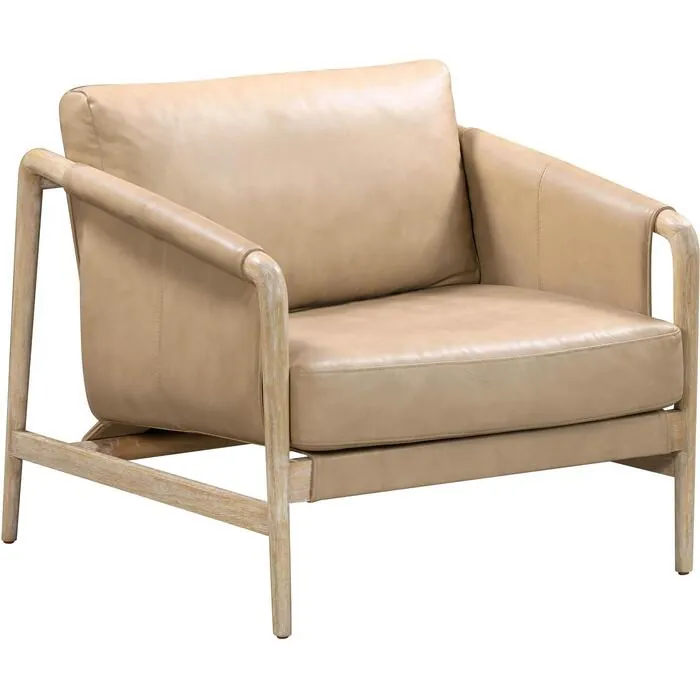 We sourced the finest materials for the Chakka Tan Genuine Leather Accent Chair. Crafted with a beautiful lightly distressed, semi aniline top-grain imported genuine bovine leather, complemented by a solid wood frame, wire-brushed individually by artisans for a textured finish that is totally unique. This chair embodies laid-back luxury. Its perfect neutral tones and wabi-sabi style add an earthy touch to any space. Discover the perfect blend of comfort and high-end style in this timeless and character-filled chair.