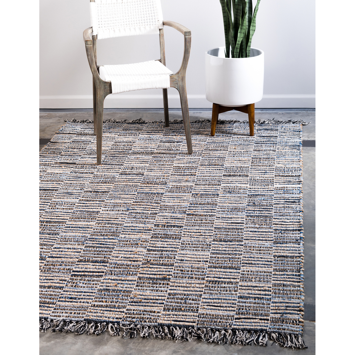 Unique Loom Checkered Chindi Jute Rug in Blue Rectangular 3142856