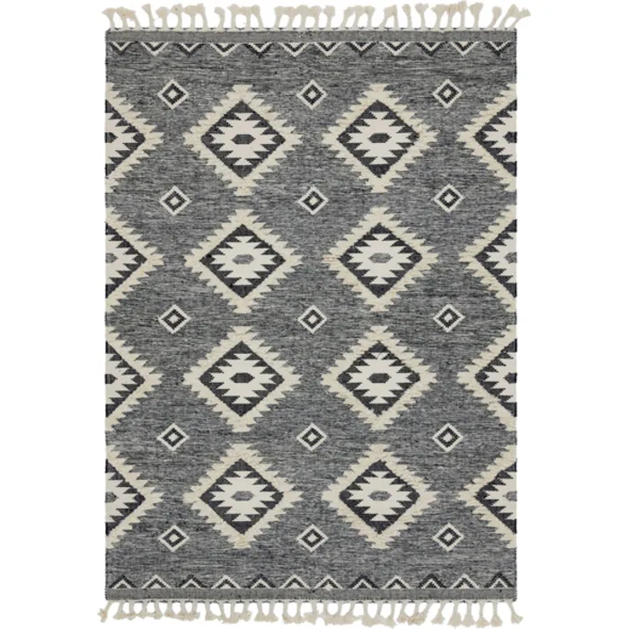 The geometric tribal pattern of the Mesa Collection brings an exciting southwestern flair to any room. The woven construction contrasts with raised areas and fringe for even more visual interest. The subdued color palettes and transitional design keep it from becoming too overbearing whether in a modern or traditional style room.