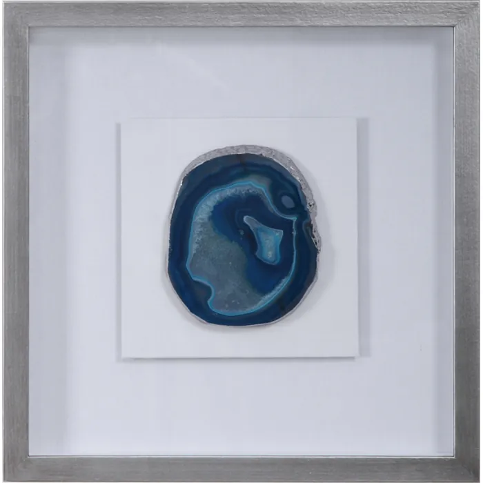 Finish: A Pine Wood Shadow Box Featuring A Hand Applied Silver Leaf Finish Showcases A Striking Blue Agate Stone With Light Blue Veining, Accented With Hand Painted Silver Edging. Mounted On A White Linen Backing.