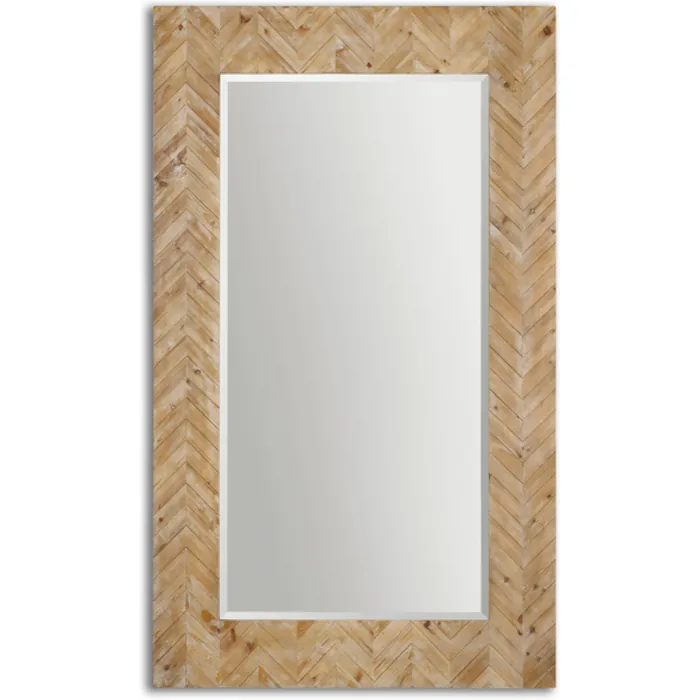 This stately mirror features a chevron patterned, solid wood frame finished with a light gray glaze. Mirror has a generous 1 1/4" bevel. May be hung horizontal or vertical. Designer: John Kowalski Dimensions: 44 W X 74 H X 2 D (in) Weight (lbs): 84 Ship Via UPS: No UPC Number: 792977070680