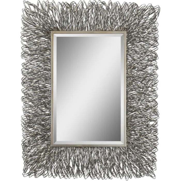 This decorative mirror features a hand forged metal frame with a silver finish and light champagne highlights. Mirror has a generous 1 1/4" bevel. May be hung either horizontal or vertical.