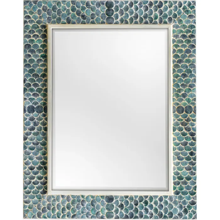 This Unique Design Takes A Whimsical Approach By Adorning A Solid Wood Frame With Fiber Glass Mermaid Scales, Hand Painted In Shades Of Tropical Blues, Accented With A Heavy White Wash. Mirror Is Beveled. May Be Hung Horizontal Or Vertical.