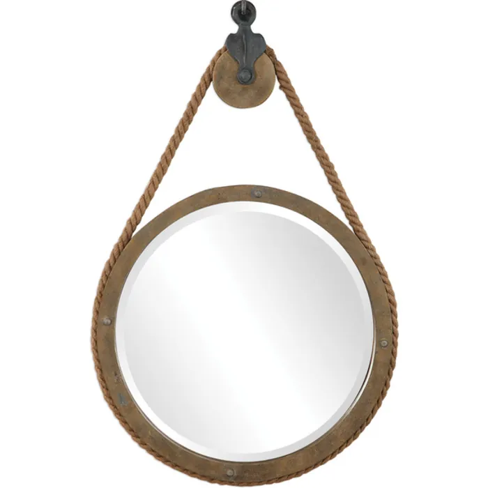 - This Rustic Mirror Design Features An Aged Natural Wood Finish With Exposed Nail Head Accents And Thick Rope Detailing That Surrounds The Mirror's Frame. The Mirror Is Hung Using An Antique-inspired Pulley With Aged Black Detailing And A Matching Aged Black Decorative Hanging Hook. This Round Mirror Incorporates A Generous 1" Bevel.