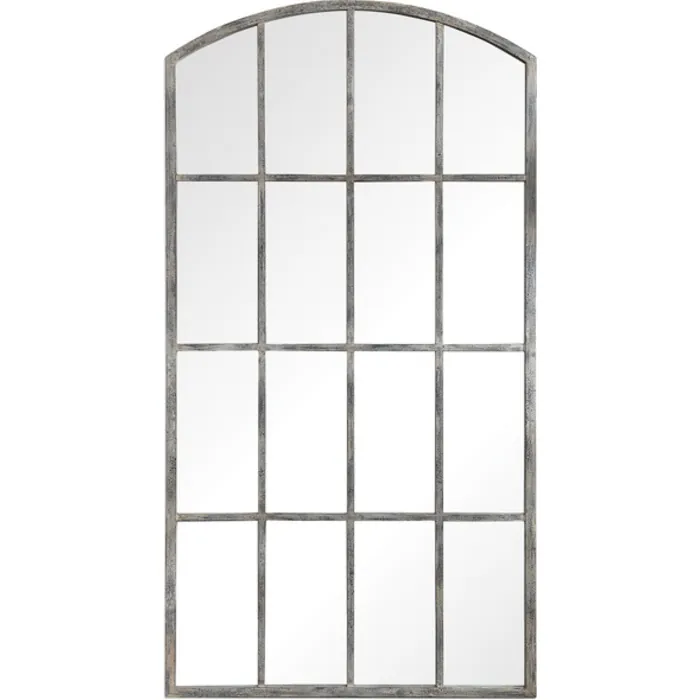 - Contemporary And French Country Styles Merge In This Arched Mirror. Reminiscent Of A Large Window, This Piece Features A Hand Forged Iron Construction With An Aged Rust Gray Finish That Has Been Distressed And Covered In An Off White Wash.