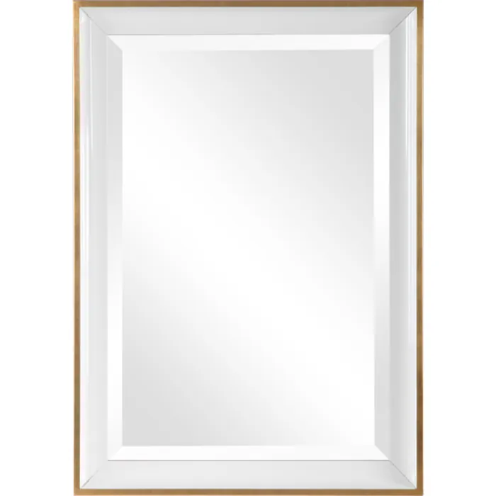 This Elegantly Refined Design Has A Large Gloss White Inner Frame Accented By A Petite Gold Leaf Outer Frame. The Mirror Has A 1" Bevel And May Be Hung Horizontal Or Vertical.