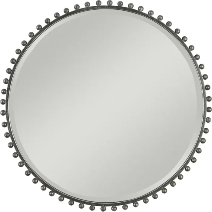 Petite Iron Spheres Line The Outer Edge Of This Round Frame, Finished In A Distressed Black With Silver Highlights And A Light Gray Glaze. Mirror Features A Generous 1 1/4" Bevel.