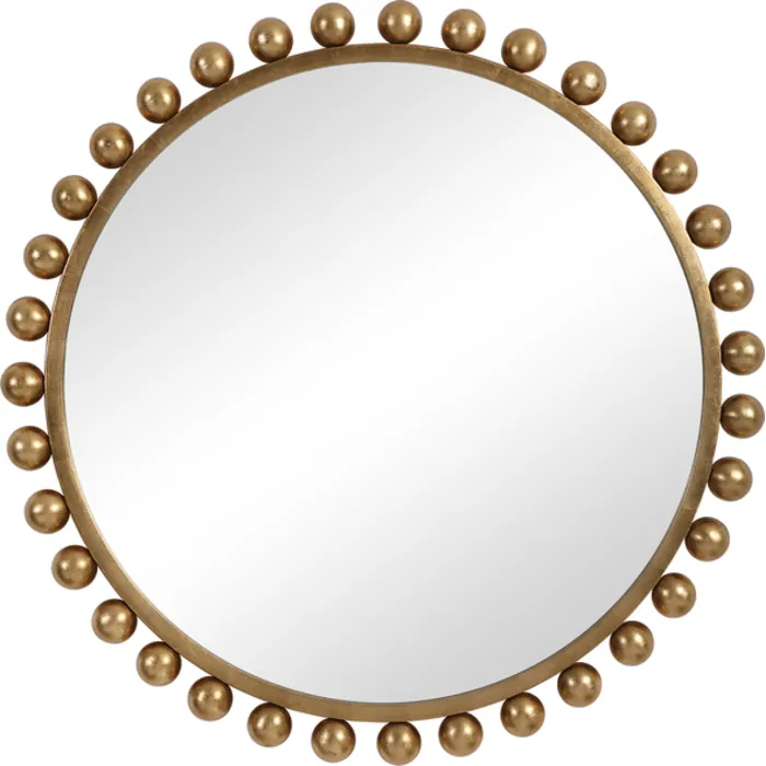 - This Eye Catching Round Mirror Adds An Upscale Look And Sophisticated Style To Any Room By Showcasing Smooth Iron Spheres That Embellish A Sleek Inner Frame, Finished In A Clean Metallic Gold Leaf.