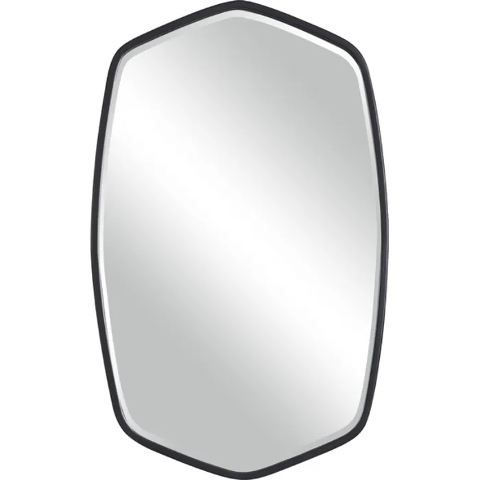 - This Hand Forged Iron Mirror Frame Features A Unique Shape With Elegant Curves, Finished In A Streamlined Satin Black. Mirror Has A Generous 1 1/4" Bevel.