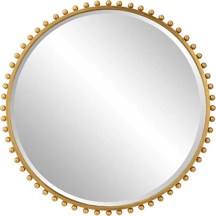 - Petite Iron Spheres Line The Outer Edge Of This Round Frame, Finished In A Timeless Gold Leaf. Mirror Features A Generous 1 1/4" Bevel.