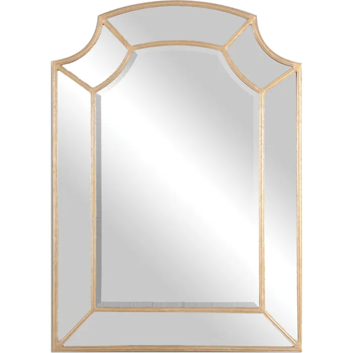 Hand forged metal arch frame with scooped corners, has a lightly antiqued gold leaf finish. Mirror has a generous 1 1/4" bevel. Designer: Grace Feyock Dimensions: 32 W X 44 H X 1 D (in) Weight (lbs): 37 Ship Via UPS: No UPC Number: 792977129296