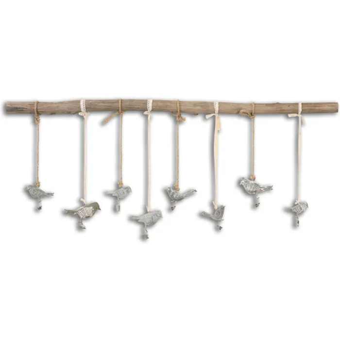 Small metal birds finished in a dark bronze with a light ivory glaze suspended from a natural Elm branch with ivory ribbon and natural rope. Each bird has a clip at feet for hanging pictures or notes. Size and shape of branch will vary. Designer: NA Dimensions: 45 W X 23 H X 1 D (in) Weight (lbs): 5 Ship Via UPS: Yes UPC Number: 792977138854