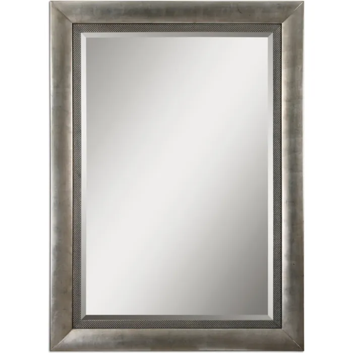 This stately mirror features a wood frame finished in antiqued silver leaf with black undertones and a gray glaze. Mirror has a generous 1 1/4" bevel. May be hung horizontal or vertical.