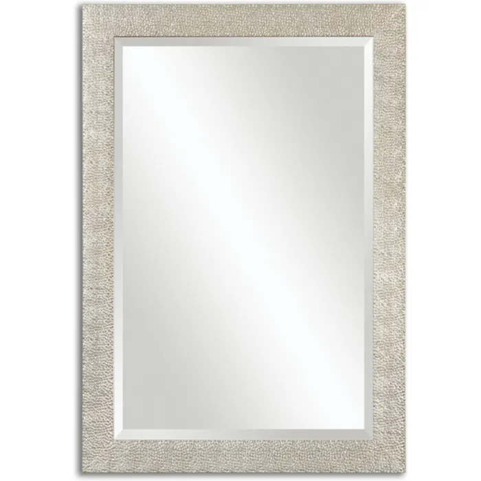 Frame has a textured profile finished in a lightly antiqued silver. Mirror features a generous 1 1/4" bevel. May be hung horizontal or vertical. Designer: NA Dimensions: 29 W X 41 H X 1 D (in) Weight (lbs): 38 Ship Via UPS: Yes UPC Number: 792977144954