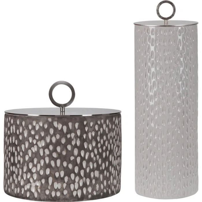 - Ceramic Containers Feature Carved Detailing And Are Finished In Off-white And Smoke Gray Crackle Glazes With Respective Aged Gold And Brushed Nickel Finished Lids. Sizes: S-9x9x9, L-6x19x6