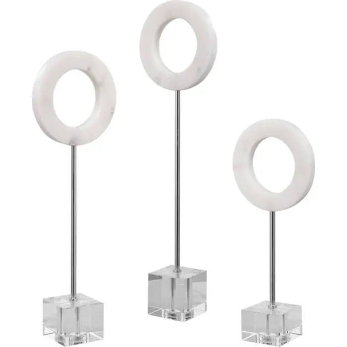 - Contemporary Trio Features Solid White Marble Rings Supported By Polished Chrome Rods And An Elegant Crystal Base. Sizes: S-6x15x3, M-6x19x3, L-6x22x3