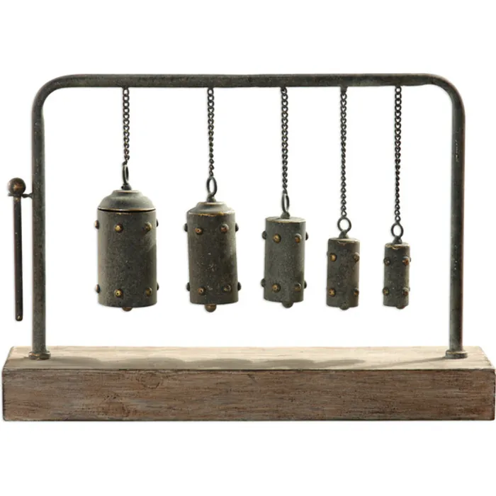 - A Tabletop Interpretation Of The Ancient Chinese Musical Instrument, Bianzhong, In Which The Bells Graduate In Size To Provide A Different Sound When Struck With The Mallet. Displayed On A Fir Wood Base.
