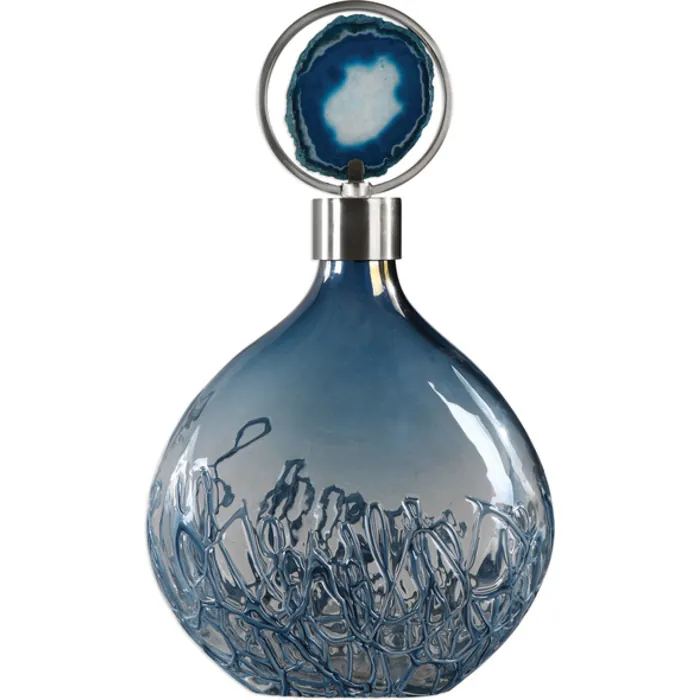 - Sky Blue Iridescent Glass With Blue Sugar Spun Accents And Brushed Nickel Plated Removable Lid With Blue Agate Stone Displayed In The Center Of The Iron Circle.