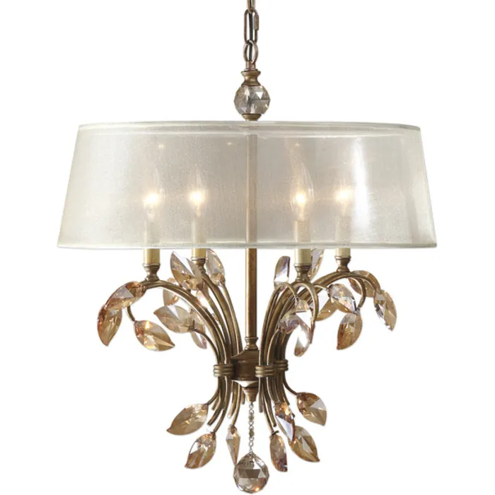 Finish: Burnished Gold Metal With Golden Teak Crystal Leaves And A Silken Champagne Sheer Fabric Shade.
