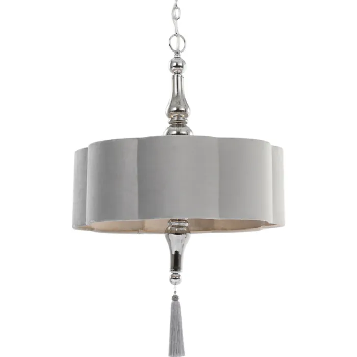 Timeless, Refined & Lavish Our Fluted Silver Mist Velvet Shade 4 Lt. Pendant Features Plated Smoke Glass Accents On The Center Column With A Chrome Finish. We Have Supplied Both An Opulent Silken Silver Gray Tassel Finial And A Chrome Ball Finial So You Can Customize To Match Your Interior Look. 4-100 Watt Max, Edison Sockets. Includes 15' Wire & 7' Chain For Adjustable Installation.