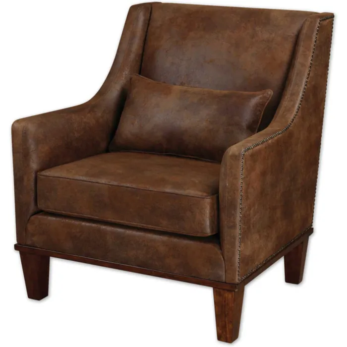Relax in this chair featuring velvety soft fabric that captures the look of natural tanned leather. Antiqued brass nail heads accent the frame along with weathered hickory stained legs and base. Pillow included. Seat height is 19".