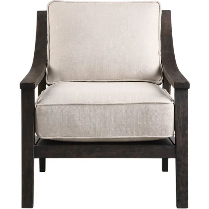 A Casual Combination With A Modern Take, This Open Back Accent Chair Features A Dramatically Curved Rustic Hardwood Frame With Exposed Grain Under A Rich Walnut Finish. Welt Trimmed Comfortable Box Cushions Are A Neutral Beige Linen Blended Fabric. Seat Height Is 18".