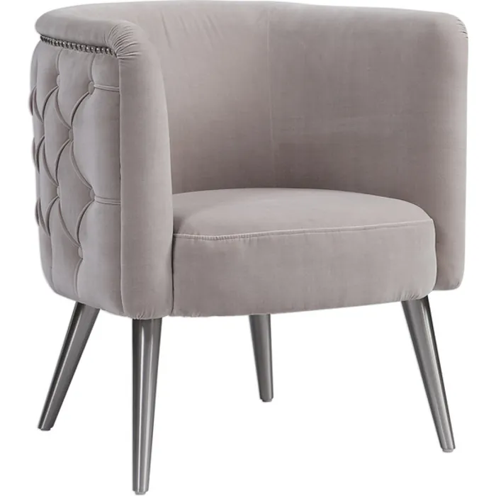 This Stylish Barrel Chair Features A Plush Diamond Button Tufted Outside In A Luxurious Champagne Velvet, Lined With Antique Nickel Nail Head Trim, On Metal Tapered Dowel Legs Finished In Brushed Nickel. Seat Height Is 19".