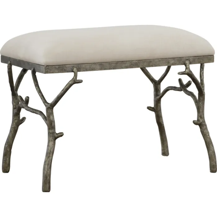 - Make A Whimsical Statement With This Molded Branch Accent Bench Featuring A Heavily Textured Antique Silver Finish, Tailored In An Off-white Polyester Fabric.
