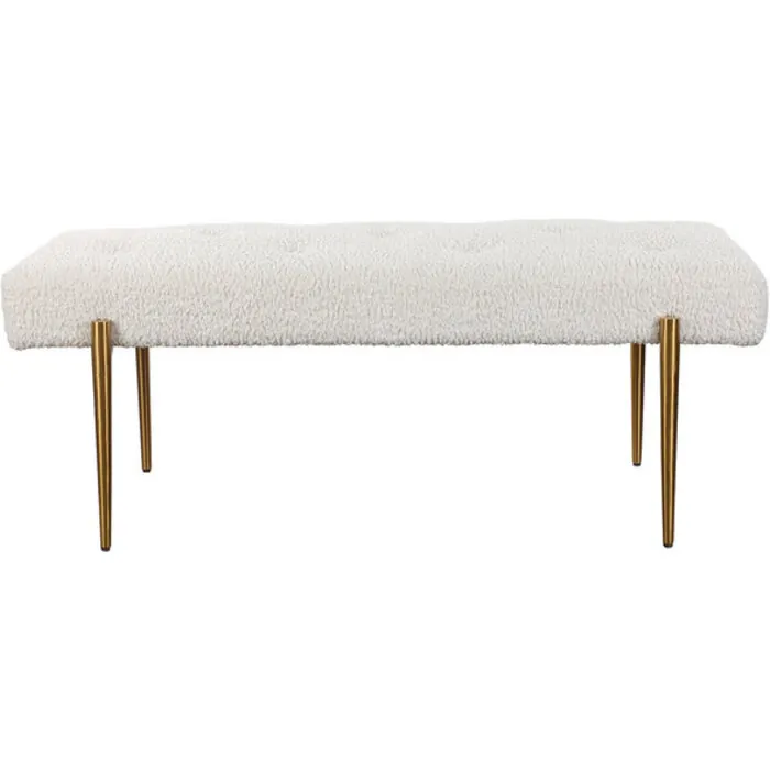 Expertly Tailored In White Faux Shearling, This Glamorous Accent Bench Features A Plush Button Tufted Seat, Atop Four Tapered Stainless Steel Legs Finished In Antique Brushed Brass.