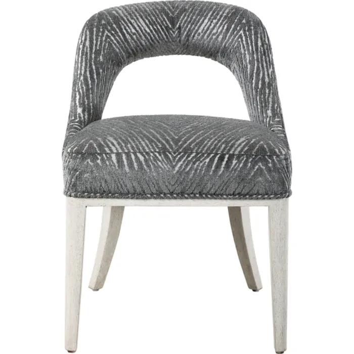 - Perfect For Dining, Office, Or Vanity Use, This Open Back Accent Chair Features A Charcoal And Light Gray Animal Print Chenille With Welt Trim Details Over A Solid Wood Frame In A Lightly Distressed Off-white Finish With Light Gray Glazed Distressing. Seat Height Is 20".