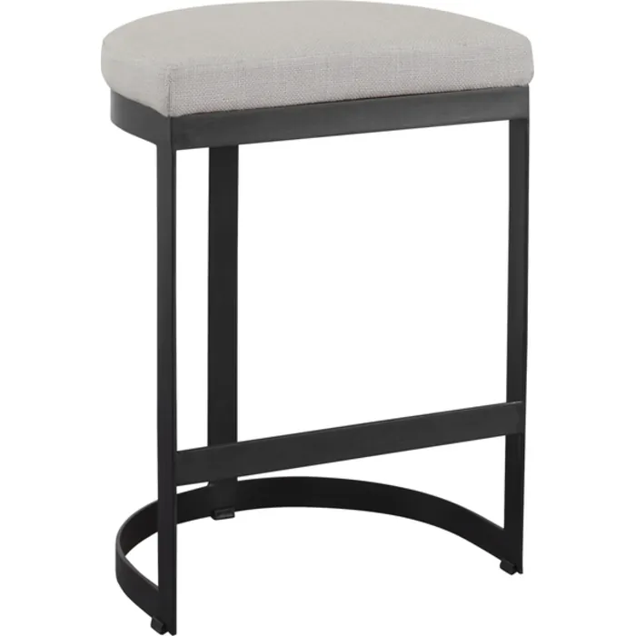 - Simplistic But Sturdy, This Statement Counter Stool Features A Thick Hand Forged Iron Base Finished In Matte Black. Plush Seat Is Tailored In An Off-white Linen Blend Fabric. Seat Height Is 26".