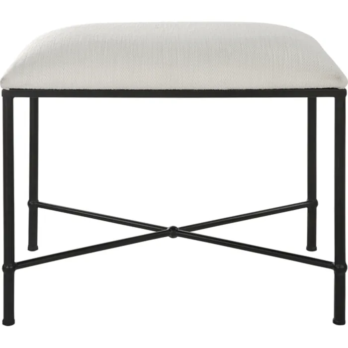 - Thoroughly Modern Yet Inspired By The Classics, This Small Bench Displays A Stylish Black And White Look Featuring An Iron Frame In Aged Black, Upholstered In A Crisp White Textured Fabric.