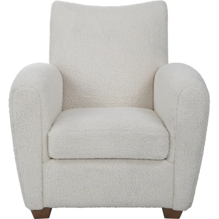 - With Its Curved Track Arms And Supportive Back, This Cozy Accent Chair Is The Perfect Balance Of Comfort And Style. Fully Upholstered In A Soft Off White Faux Shearling And Accented By Walnut Stained Wooden Feet. Seat Height Is 18".