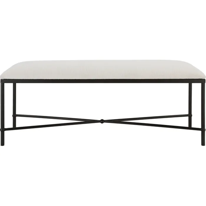 - Thoroughly Modern Yet Inspired By The Classics, This Bench Displays A Stylish Black And White Look Featuring An Iron Frame In Aged Black, Upholstered In A Crisp White Textured Fabric.