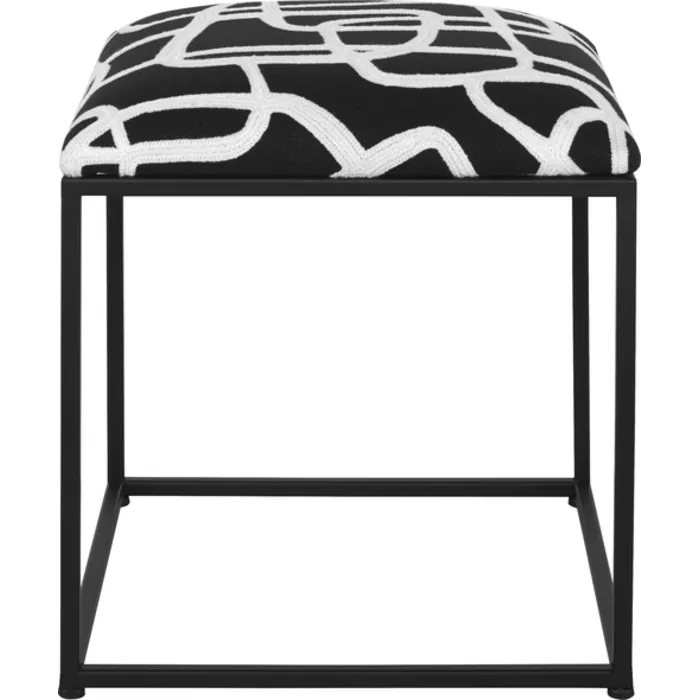 - Sophisticated With A Touch Of Whimsy, This Accent Stool Features A Cushioned Seat Upholstered In A Contemporary Black And White Embroidered Fabric, Atop A Matte Black Iron Base. Doubles As Added Seating Or A Footrest.