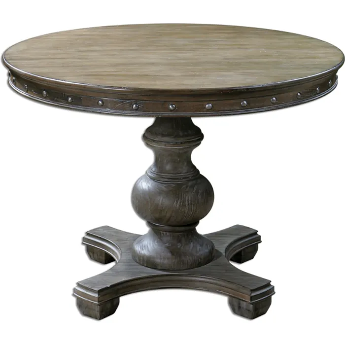 - A Light Gray Wash Softens The Look Of This Weathered, Natural Pine Table With Carved Apron And Silver Nail Accents. Sturdy Pedestal Base Is Fully Washed In Gray With Subtle Rub-through Distressing.