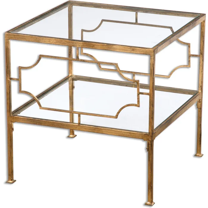 Gold leafed iron with clear tempered glass top and shelf. Designer: Matthew Williams Dimensions: 19 W X 19 H X 19 D (in) Weight (lbs): 21 Ship Via UPS: Yes UPC Number: 792977244777