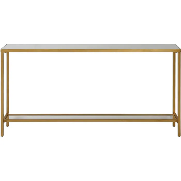 - Classic And Minimalistic, This Narrow Console Table In Iron Is Finished With Lightly Antiqued Gold Leaf, Inset With A Beveled Mirrored Top, And Gallery Shelf In Clear Glass.