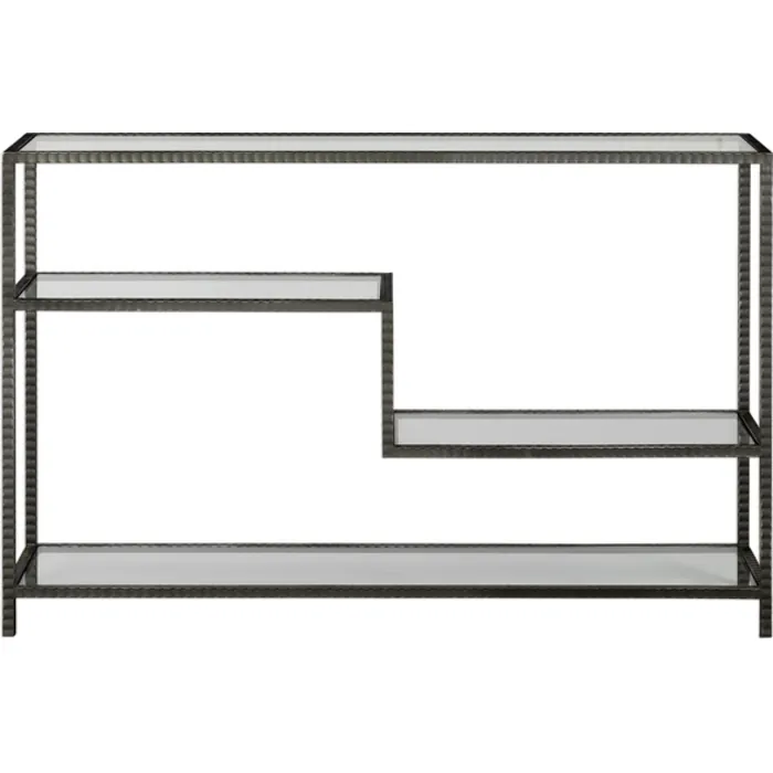 Industrial Inspired Function With Multi-level Display Shelves, Featuring Ribbed Iron Finished In An Aged Gunmetal. Shelves Are Clear Tempered Glass.