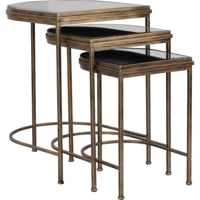 - Set Of Three Nesting Tables With An Elegantly Curved Hand Forged Iron Frame, Finished In Antique Brushed Gold With Beveled Mirror Tops.
