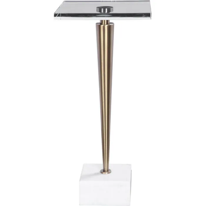 - Showcasing Style And Sophistication, This Drink Table Features A Thick Crystal Top On A Tapered Stainless Steel Base Plated In Brushed Brass, Resting On A Natural White Marble Foot.